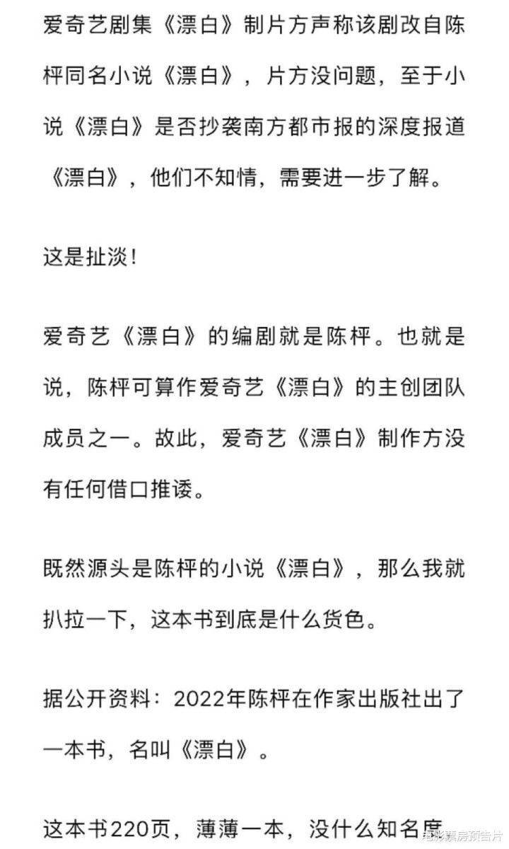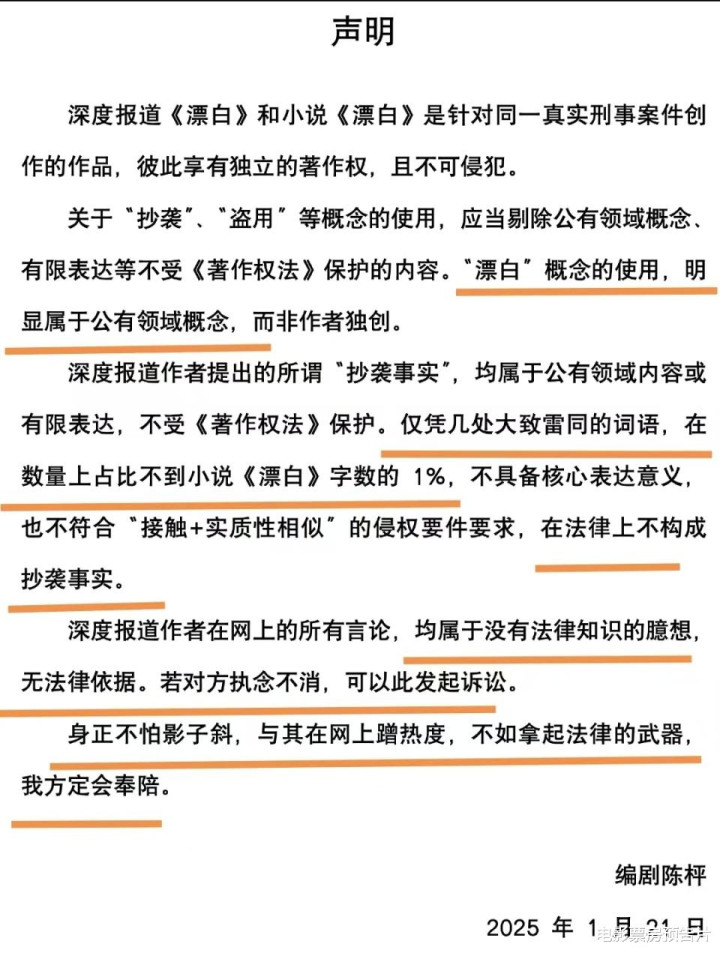 并大言不惭的说出了:“仅凭几处大致雷同的词语,在数量上占比不到小说《漂白》字数的 1%,不具备核心表达意义,也不符合“接触+实质性相似”的侵权要件要求,在法律上不构成抄袭事实。”