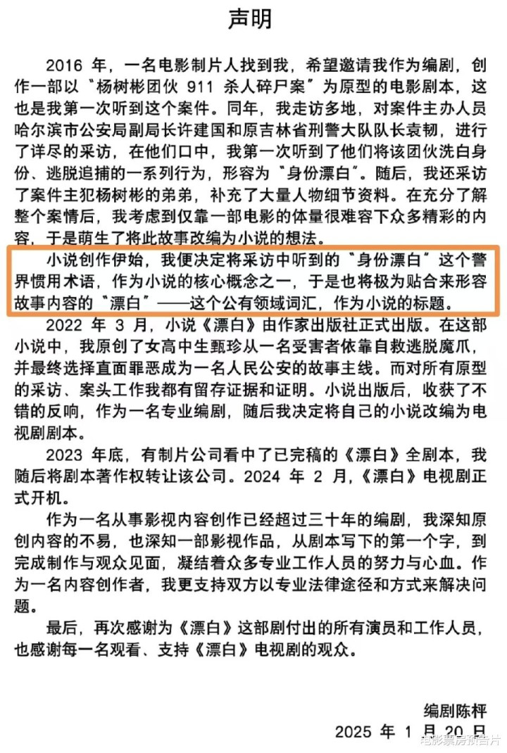 2023 年底,《漂白》剧本定稿完成,随后卖给了制片方。2024年2月,电视剧《漂白》正式开机。2025年初和大家见面。