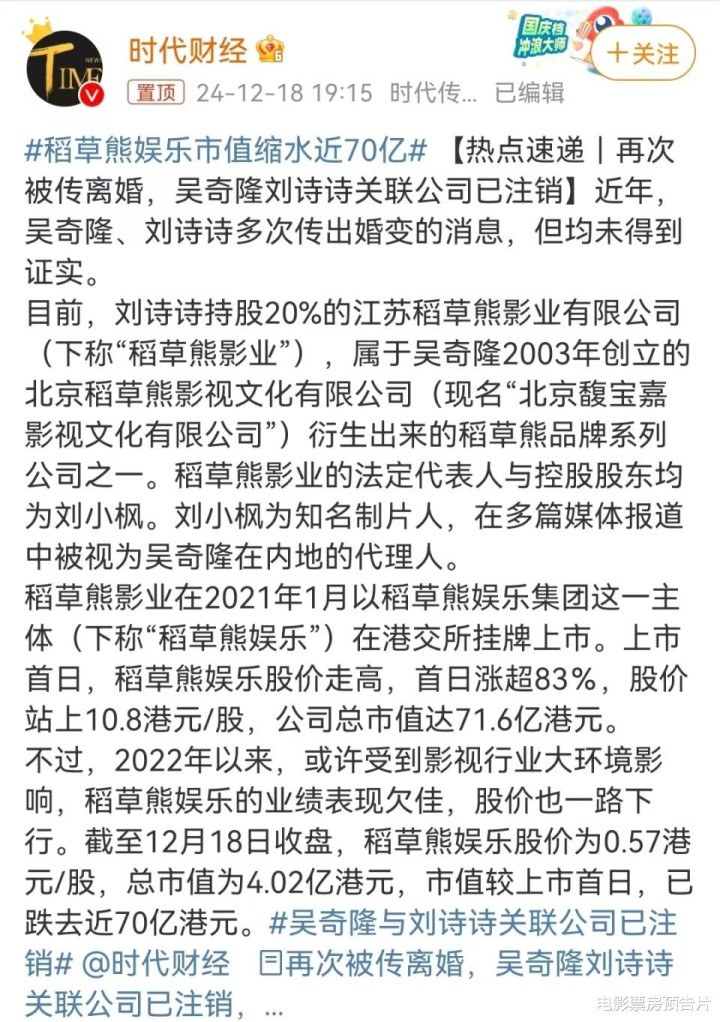 有报道称,自2022年以来,稻草熊娱乐受到影视行业大环境影响,业绩表现一路下滑,市值缩水近70亿,吴奇隆投资的影视剧,就是想依靠口碑和播放量让公司扭亏为盈。