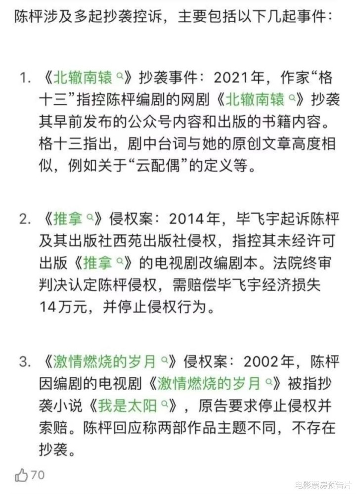 《漂白》涉嫌抄袭后,有好事者在网络上找出了,陈枰曾经参与过的影视剧作品,其中涉及多起抄袭控诉。